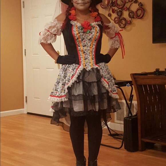 Adults Day Of The Dead Costumes Flower Sugar Skull Senorita Dress Halloween Costumes For Women Mexican Dia De Los Muertos Outfit Aliexpress. Plus size costumes, scary costumes, spooky classics, women's halloween costumes. High/low sugar skull print dress with lace sleeves and floral halter straps layered ruffle tulle skirt matching floral. Comes with matching head piece. Women's ankle strap sandal with hologram platform featuring oval shapped detailing and approximately 8 inch heel. Be sure to check the stagecoach for a petticoat and stockings. Sugar skull senorita, includes high/low sugar skull print dress with lace sleeves and floral straps, layered ruffle tulle skirt, and matching floral headband. Notify me when this product is available this festive costume includes the dress and headband. Silk flower accents and an oversized serape striped scarf pull the look together. Sugar skull senorita costume, includes high/low sugar skull print dress with lace sleeves and floral straps, layered ruffle tulle skirt, and matching floral headband. This senorita sugar skull costume includes a dress, a serape, and a sugar skull mask. This is the perfect out for halloween, parties, events and day of the dead. Worship the dead in this stunning sugar skill senorita women's costume from party king. Features a colorful day of the dead dress with sugar skull print, sequin detail, flower accents and matching headpiece. Sugar skull senorita costume features colorful day of the dead dress with sugar skull print, sequin detail, and flower accents. The stagecoach also has a mask or if you're creative, we have ben nye makeup for you to.