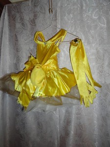 Long Belle Gloves Halloween Costume Yellow Fandom Shop . Pretty yellow satiny dress with multi layered full skirt and pink flower accents.